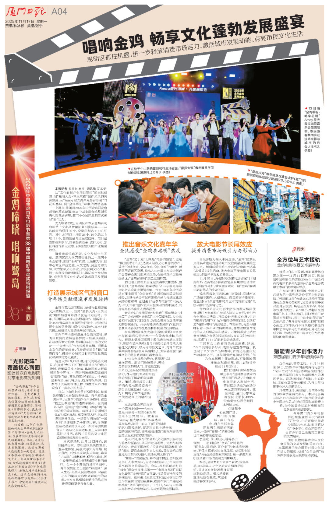 “金鸡”之于厦门,既是“电影的盛宴”,更是“群众的节日”,已是融入城市文化血脉的存在。秉持“全城金鸡、全年金鸡、全民金鸡”的理念,思明区用好辖区资源,推出Amoy星光海岸光影音乐会等群众喜闻乐见的活动,有效带动全民参与热情,让“金鸡在思明”底色更加鲜亮。