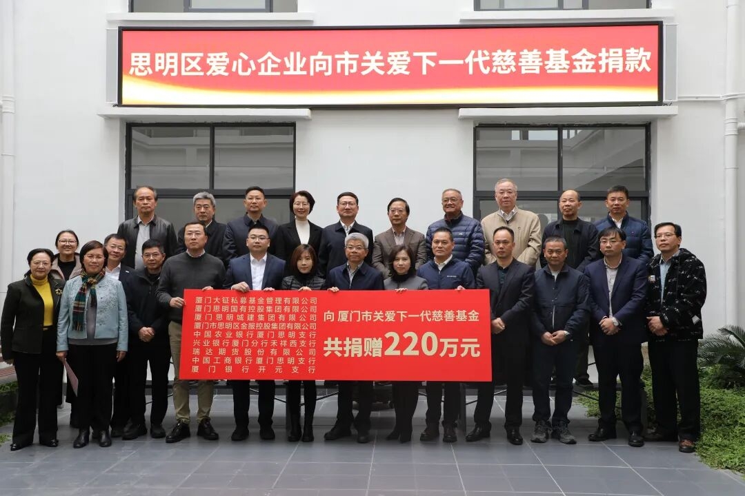 爱心捐赠仪式上,厦门大钲私募基金管理有限公司、厦门思明国有控股集团有限公司、厦门思明城建集团有限公司、厦门市思明区金服控股集团有限公司向市关工委关爱下一代慈善基金捐款共计120万元;中国农业银行厦门思明支行,兴业银行厦门分行禾祥西支行,瑞达期货股份有限公司,中国工商银行厦门思明支行,厦门银行开元支行认领共计100万元爱心项目,充分彰显了思明区爱心企业主动担当社会责任、心系下一代成长的深厚情怀。