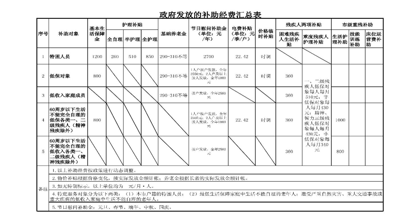 (一)对纳入补助范围并且实际入住源泉山庄老年公寓的对象(以下简称补助对象)每人每月按照源泉山庄老年公寓实际收费标准计算补助金额,源泉山庄老年公寓收费标准不得高于市场上同等养老机构的标准;补助对象以享有的政府发放的各类补助经费(含护理费、生活补助费等,详见附件1)和低保对象的最低生活保障金或者低收入对象的津补贴总金额为限支付托养费用,差额部分按本方案规定,由区民政局、区残联直接支付给源泉山庄老年公寓。因补助对象被取消低保待遇、死亡等原因终止养老服务合同等情况,源泉山庄老年公寓为其提供养老服务不足月的,按照实际天数收费予以补助。
