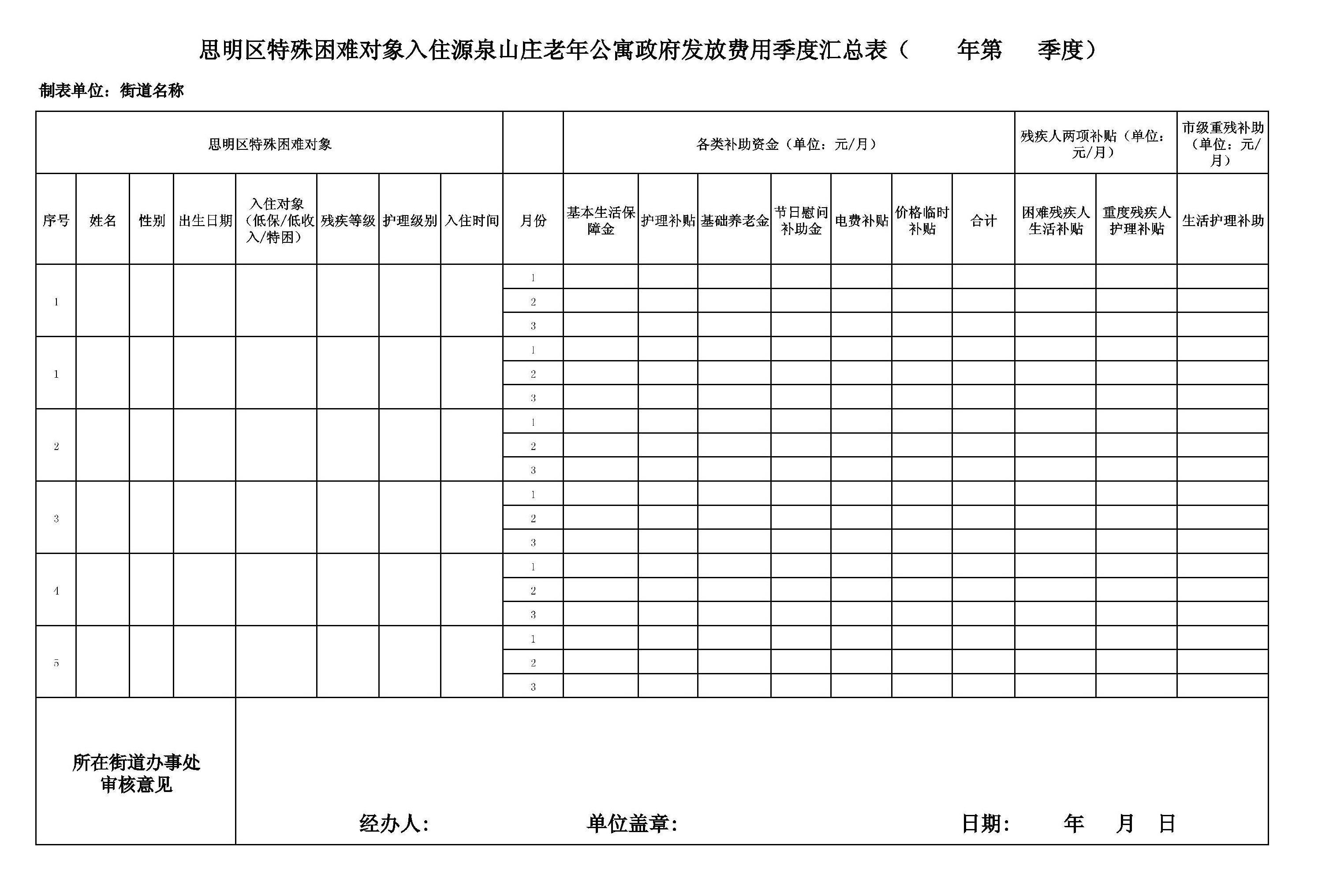 (五)区民政局、区残联审查并核算源泉山庄老年公寓上报的季度汇总表无误后,支付补助经费。