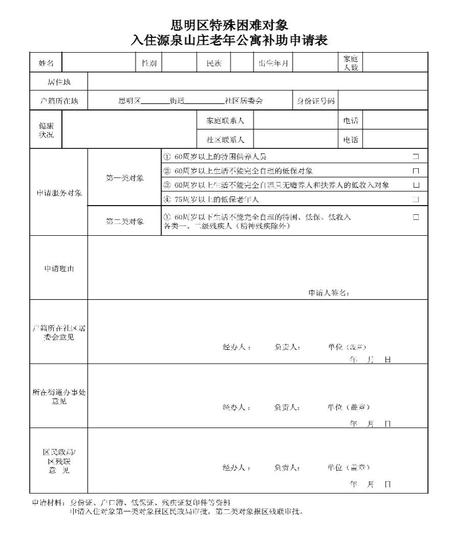 (一)受理。特殊困难对象本人或委托人向户籍所在地社区居委会提出申请,填写《思明区特殊困难对象入住源泉山庄老年公寓补助申请表》,并提交身份证、户口簿、低保证、残疾证复印件等资料,社区居委会对审批对象进行初审。