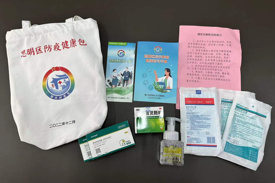 防疫健康包里不仅有《思明区居民防疫健康指引手册》《致思明区居民朋友们的一封信》以及免洗手消毒液或凝胶1瓶、普通医用外科口罩、N95口罩,还有抗原检测试剂、双黄连合剂(无糖型)1瓶或感冒灵颗粒1盒(随机发放)。