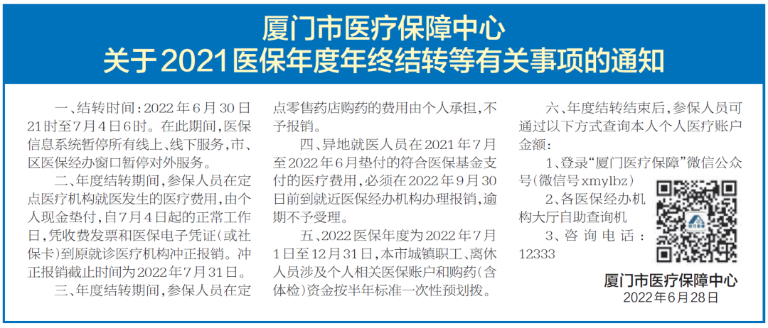 一、结转时间:2022年6月30日21时至7月4日6时。在此期间,医保信息系统暂停所有线上、线下服务,市、区医保经办窗口暂停对外服务。