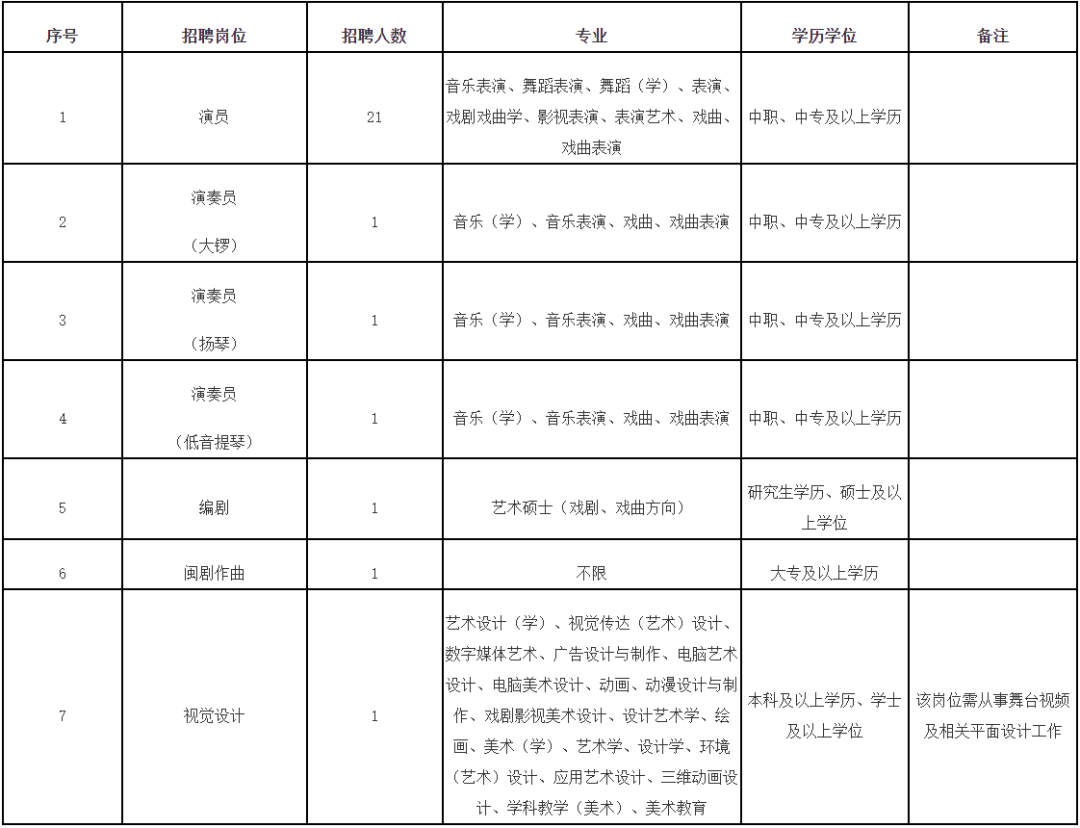 3.根据《中华人民共和国劳动法》有关规定,该方案中岗位序号1演员岗位年龄要求为16周岁以上、35周岁以下(在1986年4月至2006年4月期间出生);岗位序号2-7演奏员、编剧、作曲、视觉设计岗位年龄要求为18周岁以上、40周岁以下(在1981年4月至2004年4月期间出生);